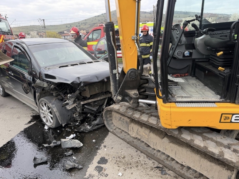 În accident au fost implicate un autoturism și un buldoexcavator. O femeie nu a putut ieși singură afară din autoturism, astfel că pompierii au extras-o în siguranță.